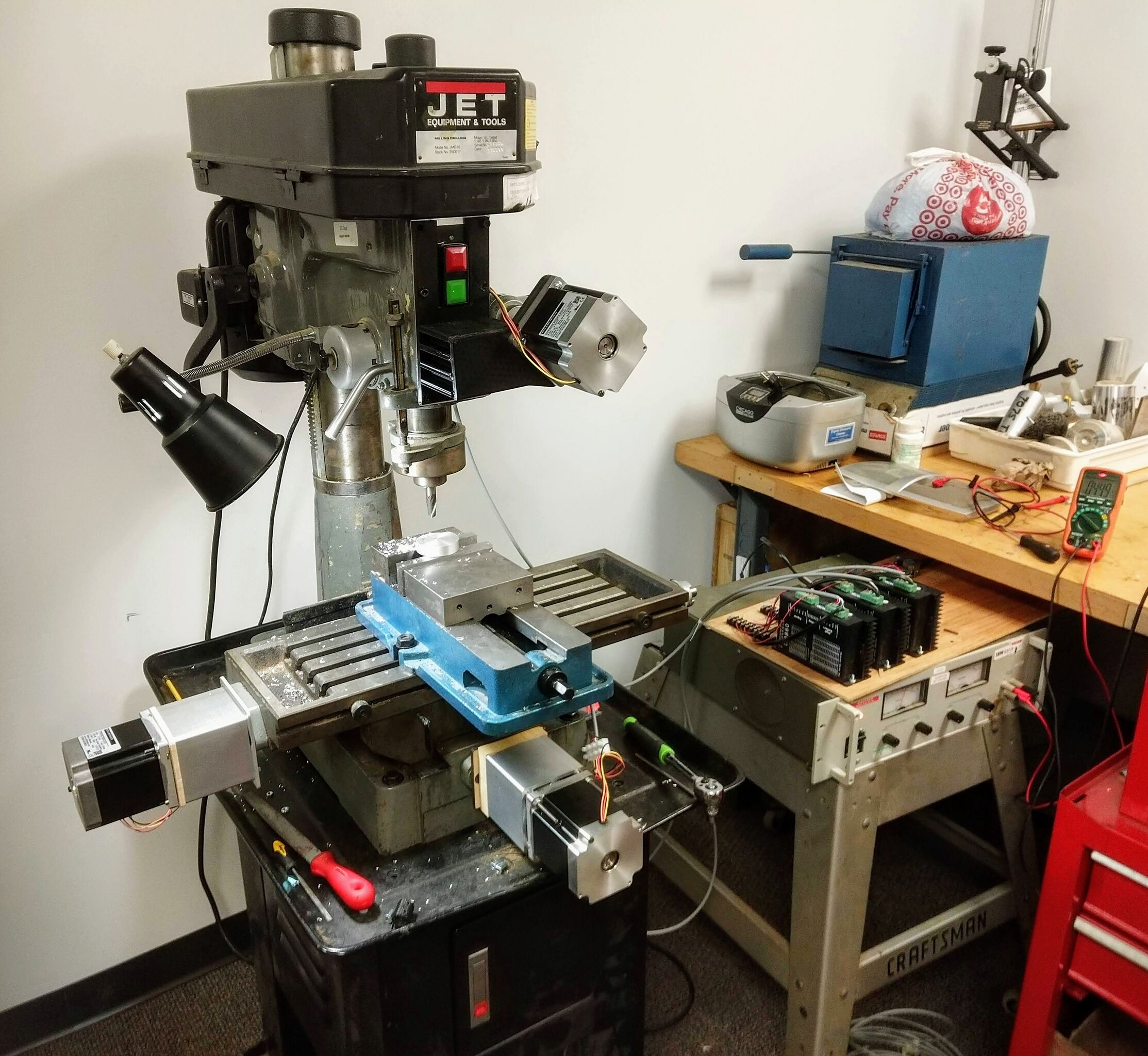 Hacksburg's CNC converted Jet JMD-15 Mill/Drill. The motor controllers and Arduino Uno are visible on the left, on top of an HP DC power supply. The stepper motors that move the axes can also be seen.